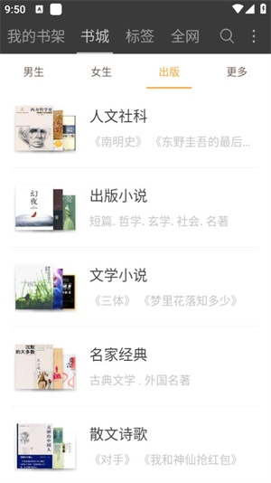 5、除了小说之外,我们还可以获取到人文社科、出版小说、文学小说、名家经典等类型的书籍。