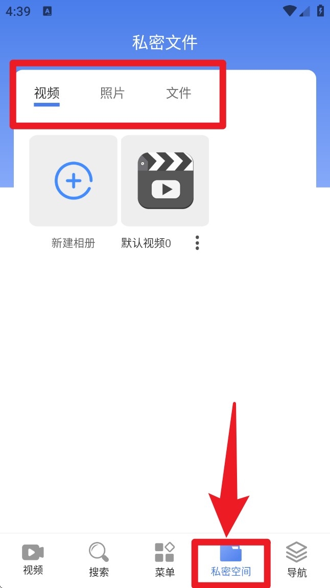 4.切换到底部“私密空间”页面,管理私密视频、照片与文件内容,自定义创建相册。