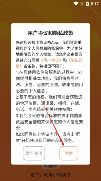 2、进入后同意小熊阅读app的使用权限