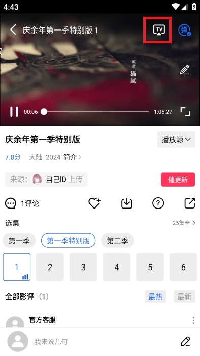 在播放界面可以选择投屏功能,直接投屏到电视上。