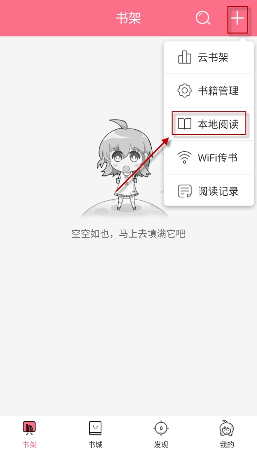 2、然后点击右上角的加号,接着点击“本地阅读”选项。