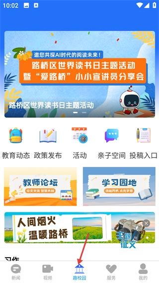 3、进入趣校园板块,可参与路桥区世界读书日主题活动,查看教育动态政策发布,还有教师论坛学习园地等板块,丰富学习与交流体验。