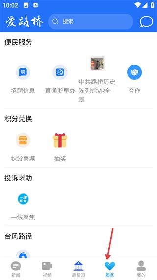 4、打开服务板块,能使用招聘信息直通浙里办等便民功能,还可在积分兑换区域进入积分商城抽奖,同时能通过一线聚焦进行投诉求助。