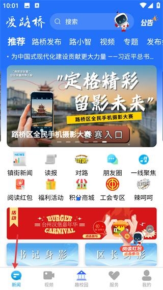 1、进入应用先浏览推荐板块,这里有路桥发布的内容,还有全民手机摄影大赛入口,可参与活动定格精彩,同时能查看镇街新闻读报等功能。