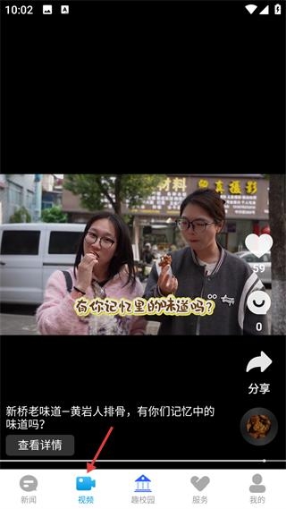 2、切换到视频板块,能看到新桥老味道相关内容,比如黄岩人排骨的分享,可通过点赞按钮互动,还能点击查看详情了解更多本地美食信息。