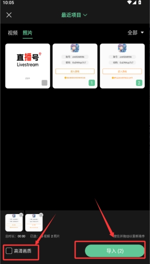3、点击需要编辑的图片选择左下角的高清画质再按右边的导入即可。