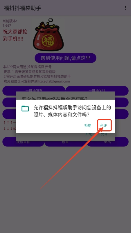 1、使用福多多福袋助手,首先需要给予其访问设备文件的权限,这允许助手读取和写入必要的抽奖数据。