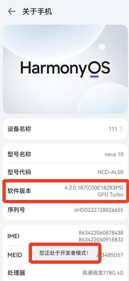 3、再连续点击版本号7次,多点几次就能进入开发者模式。部分手机下方会显示【您正处于开发者模式】,手机型号不同显示的不一定是一样的。