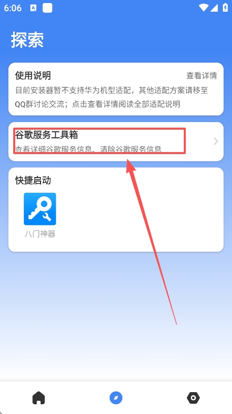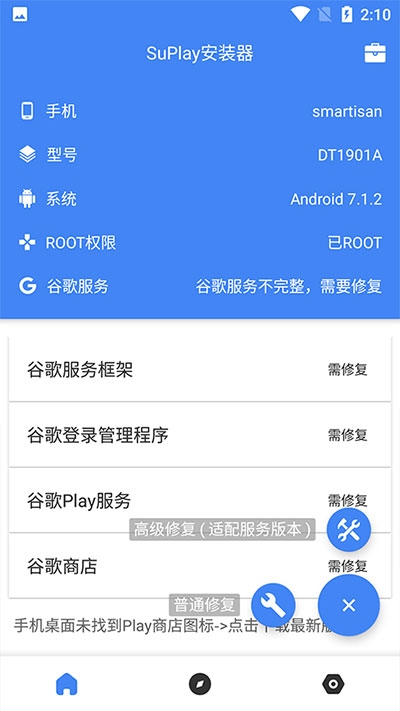 1、在本站安装好app后,打开它,然后软件会自动获取你的手机信息,之后点击下方的修复键位,对谷歌服务进行修复。