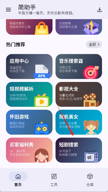1.打开简助手app,在首页可以看到各种热门推荐功能。