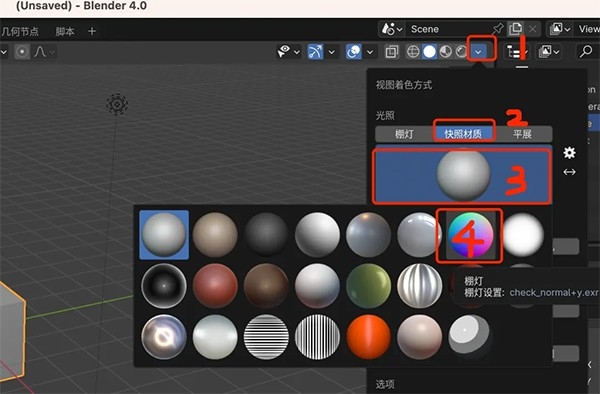 在右上角的小三角下拉菜单将【光照】改成【快照材质】,并选择蓝紫色的材质球。