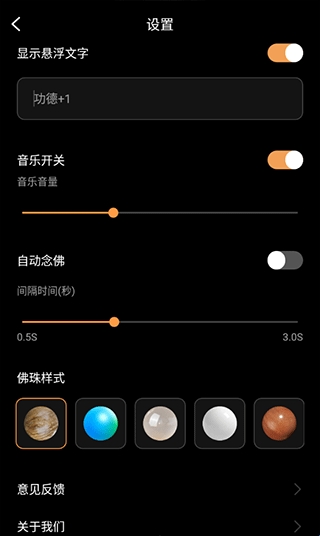 2、点击齿轮标志进入设置界面,可自定义悬浮文字、调整音量、开启自动念佛功能以及选择电子佛珠皮肤。