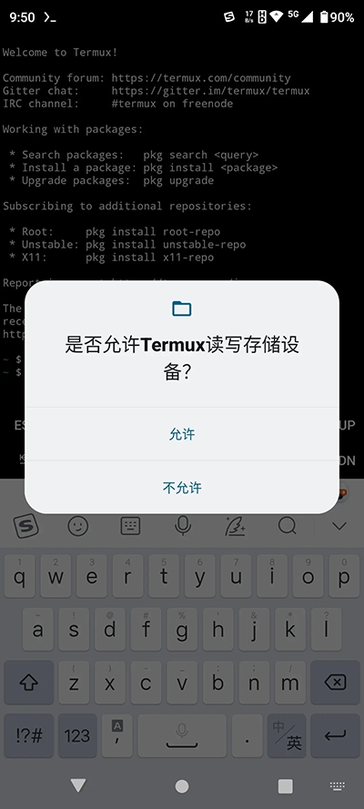 在 Termux中输入命令 termux-setup-storage回车以获取储存权限(注:长按后按 Paste粘贴),如下图,点允许即可。